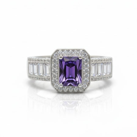 Sterling Silver Emerald Cut Amethyst Clear CZ Ring-AE-73