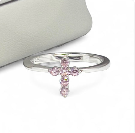 Sterling Silver Cross Pink CZ Ring-AE-82