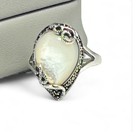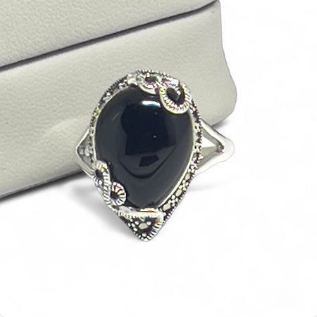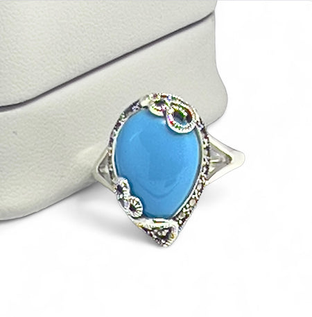 Sterling Silver Pear Shape Simulated Turquoise Marcasite Ring-AE-88