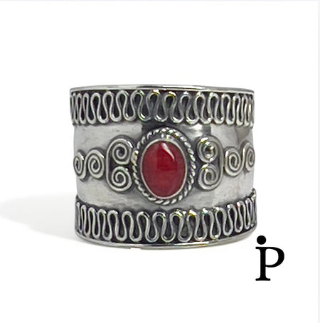 Sterling Silver Bali Style Red Coral Stone Ring-SR-49